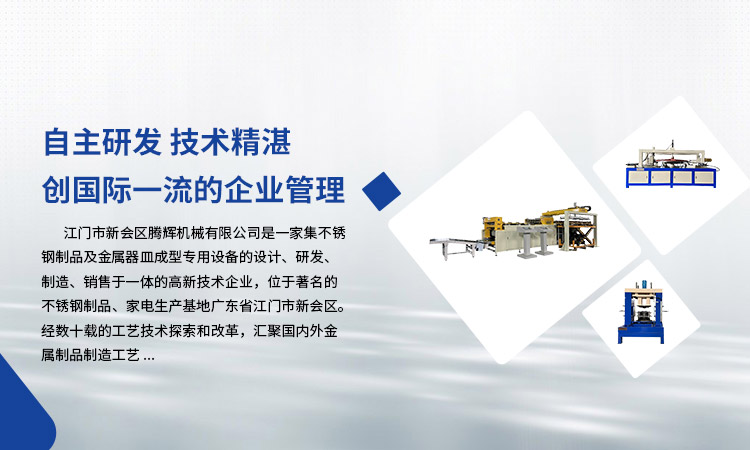 江門市新會區(qū)騰輝機械有限公司是一家集不銹鋼制品及金屬器皿成型專用設備的設計、研發(fā)、制造、銷售于一體的高新技術企業(yè),位于著名的不銹鋼制品、家電生產(chǎn)基地廣東省江門市新會區(qū)。經(jīng)數(shù)十載的工藝技術探索和改革,匯聚國內(nèi)外金屬制品制造工藝。
